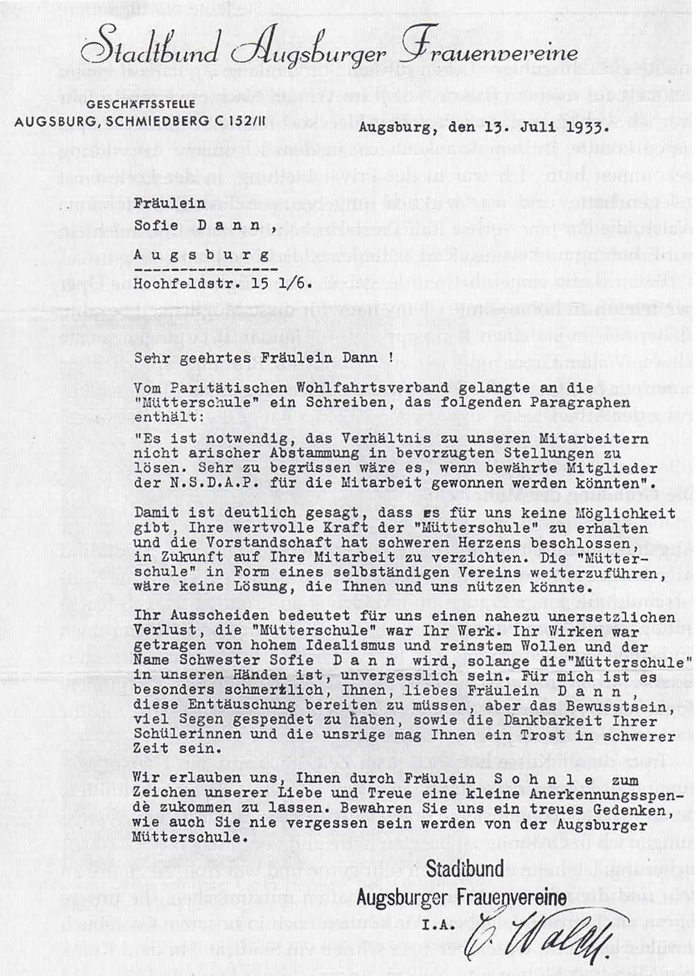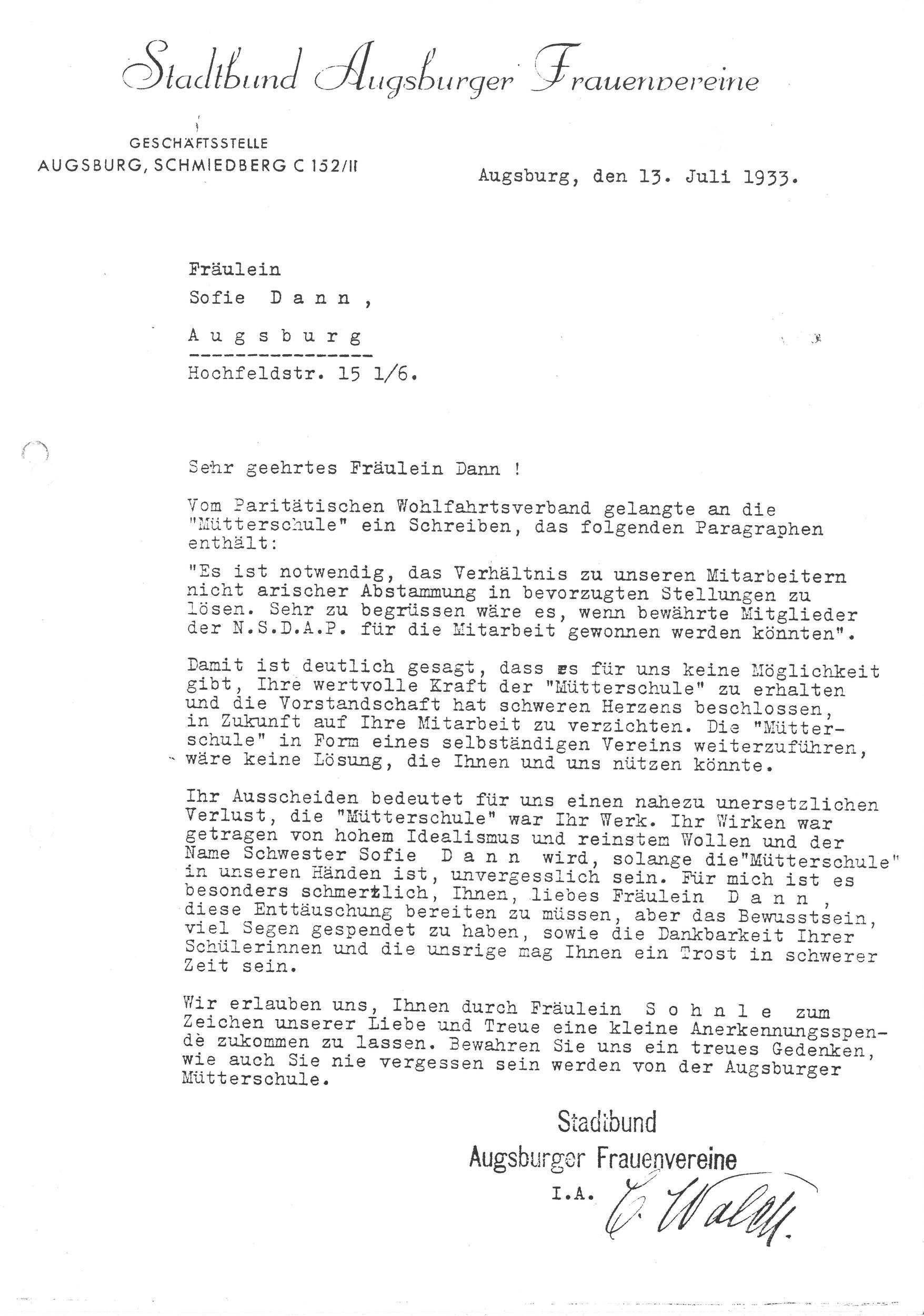 Jüdisches Museum Augsburg Schwaben, JKM 2003-15.36, Stadtbund Augsburger Frauenvereine an Sophie Dann, 13. Juli 1933.