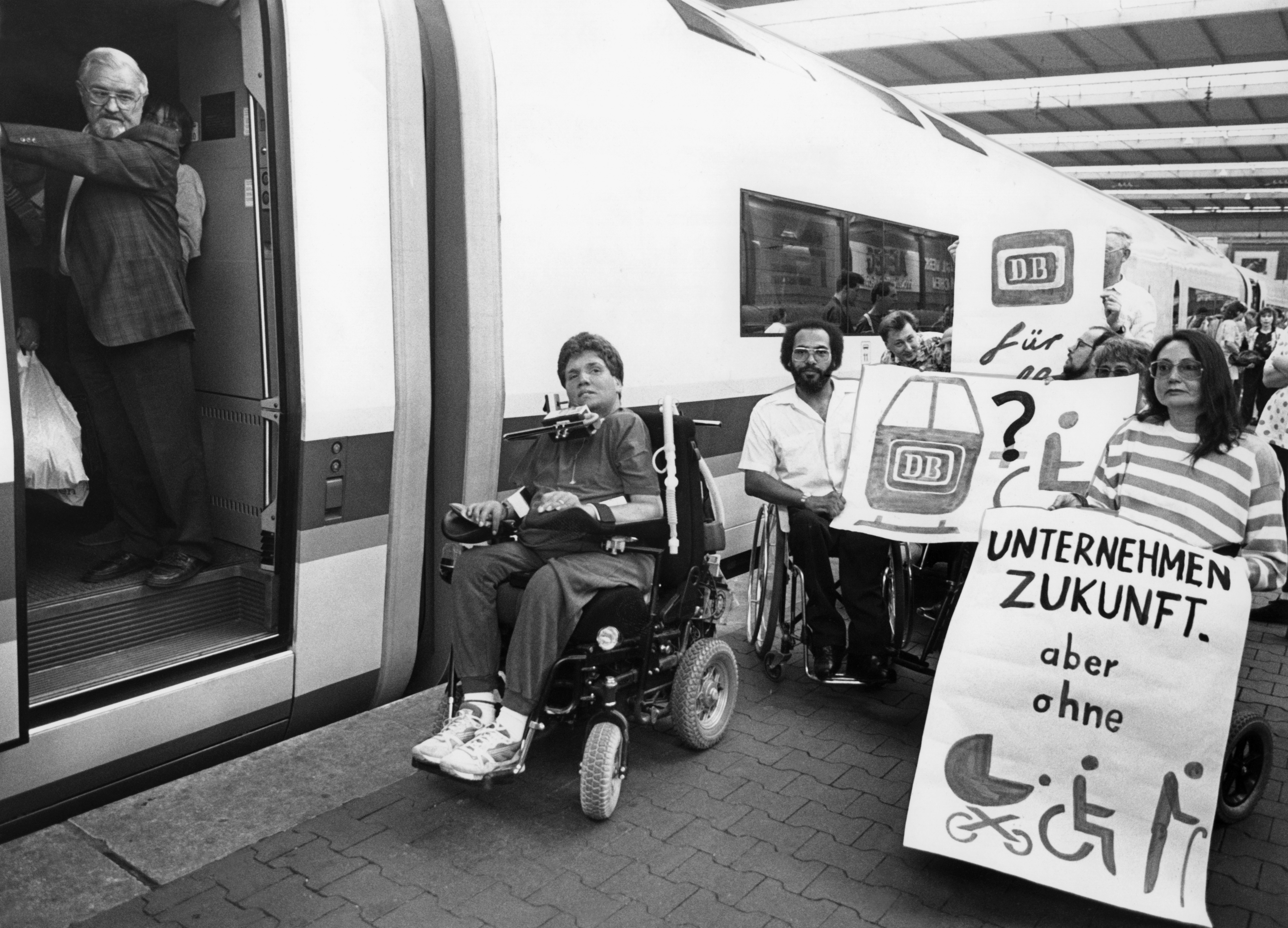 Rollstuhlfahrende demonstrieren auf einem Bahnsteig am Hauptbahnhof München für barrierefreie Zugänge zu den Zügen der Deutschen Bahn, 1995, Copyright: Karl-Heinz Egginger/Süddeutsche Zeitung Photo.